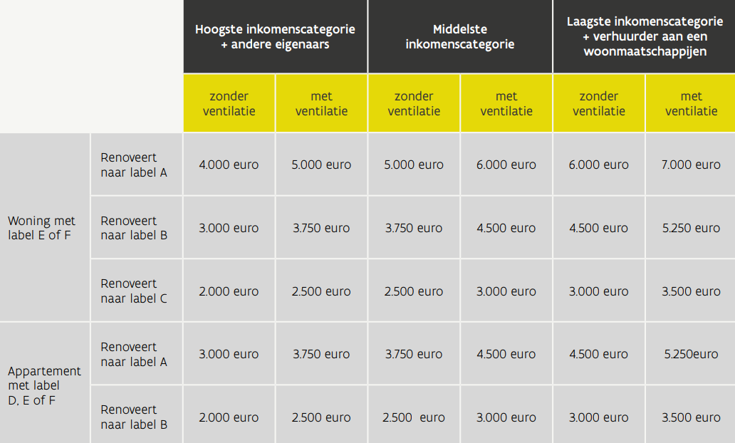 Om in aanmerking te komen, moeten zowel een EPC‑attest voor de werken (opgemaakt vanaf 2019 en uiterlijk op 31/12/2026) als een EPC‑attest na de werken beschikbaar zijn. Onderstaan premies zijn momenteel van toepassing: